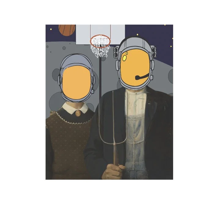 This piece reimagines American Gothic with a sci-fi twist, blending classic Americana with cartoon space helmets and a surreal basketball backdrop. It’s a playful take on tradition, pop culture, and the idea of home, wherever that might be.